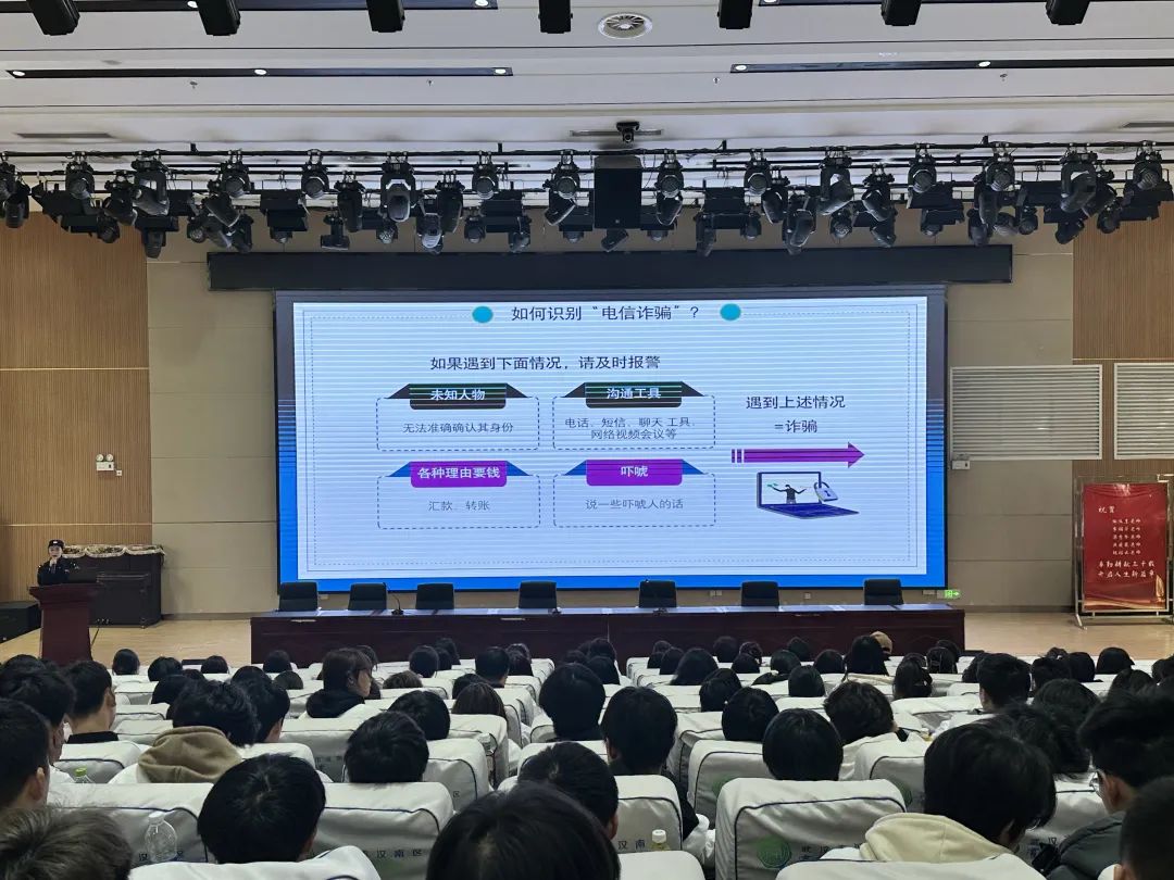 本次防范电信诈骗讲座活动由学工处甘主任主持,汉南区纱帽派出所的廖警官为全体师生讲解防范电信诈骗相关知识。