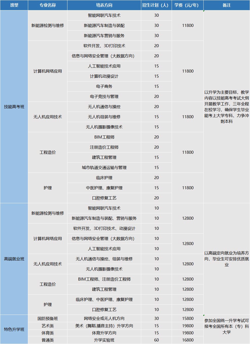 注:1、根据国家全日制学生享受2000元/人/学年学费减免的政策,我校实缴学费标准为已经减去学生享受国家补贴2000元/年学费后的费用。 2、技能高考类:技能高考是湖北省现行的普通高校招收中职,中技毕业生的高考形式,由全省统一组织,考试内容包括专业技能操作和文化综合考试。以技能操作考试成绩为主,总分490分,占比70%;文化综合考试成绩为辅,总分210分,占比30%。两项合计700分,单独招生考试由招生院校自行组织和录取