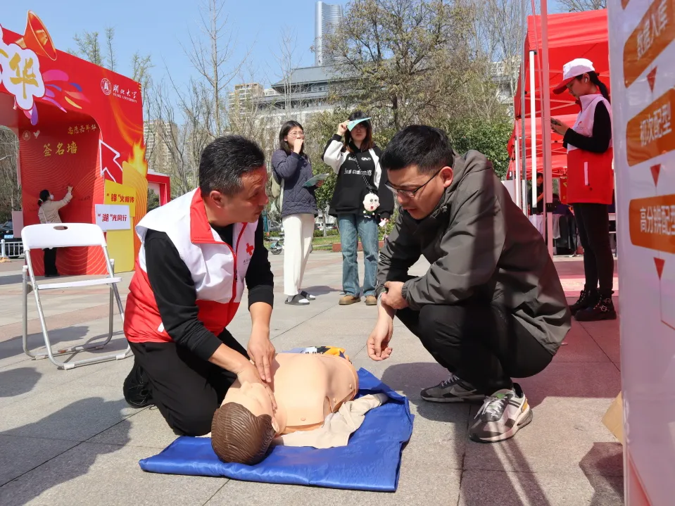 在活动现场,湖北大学校青志诚邀武昌区红十字会进校进行急救知识培训并邀请献血车进校园为生命接力为健康护航!我校的同学们观看了现场演示的急救内容,相信他们也会将所学的知识切实的应用到实际生活中去,去帮助更多需要的人!